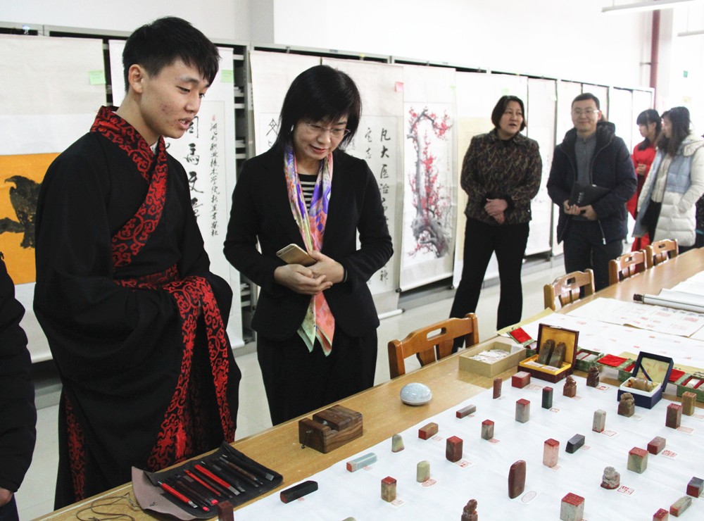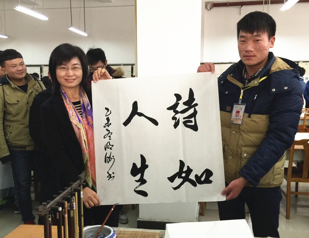 随后,李桂贞院长和邵芙蓉主席在有关人员陪同下观赏了参展作品,并给予了高度评价。学生将现场书写的作品赠送给李院长,李院长欣然接受并向学生回赠了字帖以表感谢。