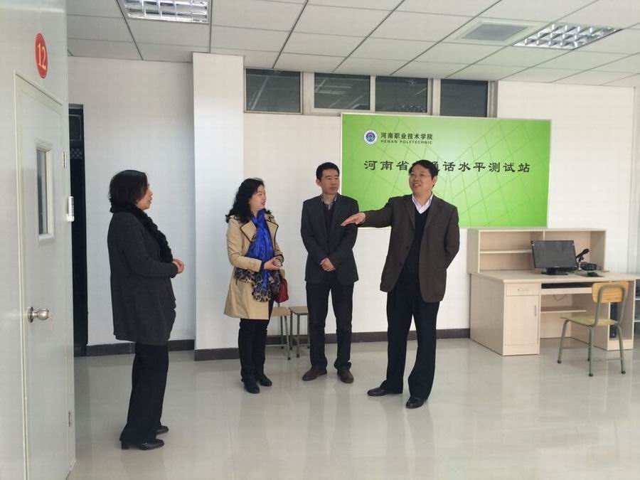 4月8日上午,在教务处王莉娜副处长和谢芳科长的陪同下,河南省教育厅语言文字应用管理处闫俊山处长和李伟民副处长,现场验收了我院计算机辅助普通话水平测试站的测试室、备测室和候测室建设,对普通话测试站的建设表示满意,并对学院近年来的语言文字工作给予了充分肯定。