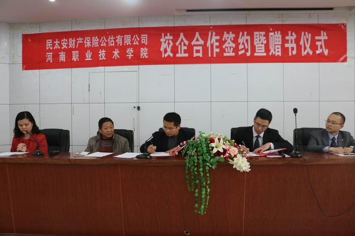 3月12日下午,我院与民太安财产保险公估有限公司在行政楼就业报告厅举行校企合作签约暨赠书仪式。合作办学处副处长李晓强代表学院与公司签订校企合作协议,并向民太安公司市场总监吕功君和河南分公司总经理助理杨永生颁发定损理赔专业指导专家及客座讲师聘书。民太安财保公司向汽车工程系赠送110册《保险公估理论与实务》。