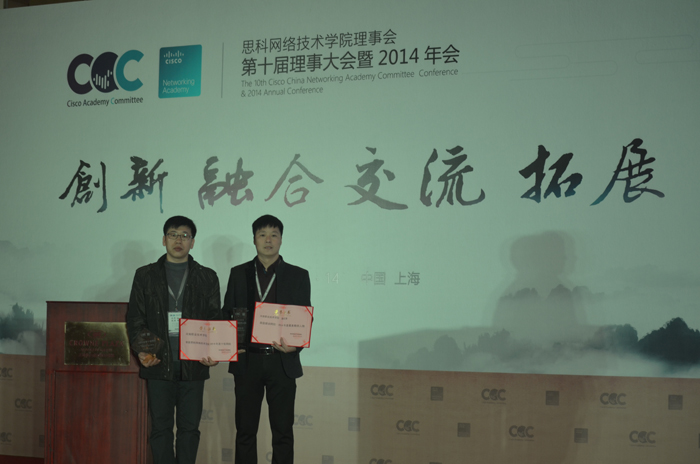 思科网络技术学院理事会第十届理事大会暨2014年会于近日在上海举行。我院思科网络技术学院荣获2014年度全国十佳优秀网院称号,信息工程系副主任谭营军和网络教研室主任娄松涛应邀参加大会。