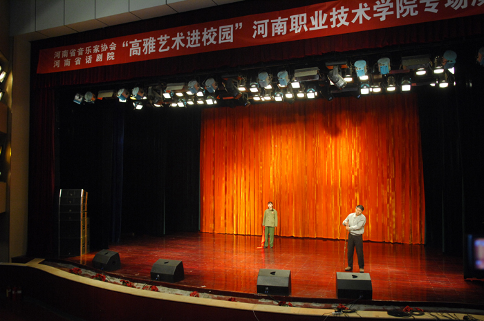 11月3日晚,由省教育厅、省文化厅、省财政厅主办的“高雅艺术进校园”活动走进我院,来自河南省音乐家协会、河南省话剧艺术中心的演员们为师生带来了一场精彩的文化艺术盛宴。院领导及师生代表共600余人齐聚音乐厅观看演出。