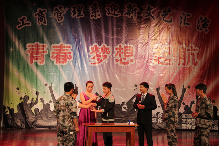 9月23日晚,工商管理系在学院音乐厅举办以“青春、梦想、起航”为主题的2014年迎新文艺汇演。副院长占江受邀出席,学工部、院团委、烹饪食品系、汽车工程系、电气工程系、工商管理系、音乐学院等有关单位负责人及全系近700名新生参加。