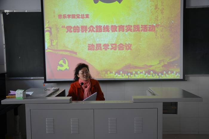 会议传达了院党委书记王长钦在学院党的群众路线教育实践活动动员会上的讲话精神,学习了《河南职业技术学院党的群众路线教育实践活动实施方案》和《论群众路线—重要论述摘编》等相关学习材料,并根据音乐学院的具体情况对教育实践活动的开展进行了安排。音乐学院院长雷红薇深入分析了存在的“四风”问题,并结合音乐学院的实际工作,对领导干部和普通党员的群众路线教育实践活动分别做了安排。她指出,音乐学院的学习活动要立足工作实际,认真做好学习计划,既要通过学习提高认识,又要通过实际行动抓落实,不仅领导干部要深入群众,普通党员教师也要深入学生当中,充分掌握相关情况,使教育实践活动取得实实在在的成效。