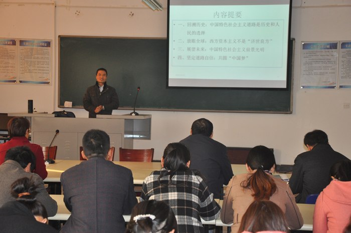 讲座中,马金伟老师从回溯历史、放眼全球、展望未来和坚定道路自信等四个方面深入浅出地阐述了对“中国道路与中国梦”的理解。他讲到,中国特色社会主义是历史和人民的选择,西方资本主义不是“济世良方” ,我们应正确认识自己,学习贯彻中央八项规定内容,以身作则、率先垂范,共同创造中国特色社会主义的光明前景。他鼓励大家坚定理想信念,坚守共产党人精神追求,做社会主义道德的示范者、诚信风尚的引领者、公平正义的维护者,以实际行动彰显共产党人的人格力量。“中国梦”的实现,关键在于我们自身的发展,每位教职工将不懈努力,促进学院的全面发展。