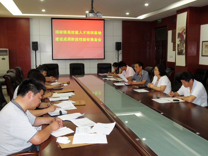 公共实训鉴定基地办公室主任张凯就国家级高技能人才培训基地建设项目验收中的佐证材料、下一阶段工作做了具体布置,要求相关单位在7月中旬将国家级高技能人才培训基地建设成果各项材料予以学院层面的预验收。公共实训鉴定基地办公室副主任吉武俊详细解释了验收材料的条目。会后,各项目负责人就建设项目涉及的问题展开讨论和交流,表示会努力完成人社部将于8月底到9月初进行的国家级高技能人才培训基地建设项目阶段性验收工作。