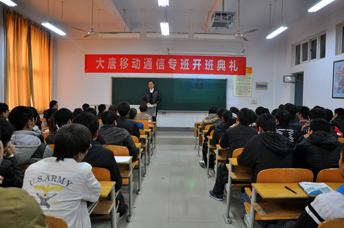 开班仪式上,彭志宏副院长首先代表学院对通信专班的成立表示祝贺。他指出,“订单式”人才培养模式是我院的办学特色之一,大唐移动通信专班的成立可以促进学院在移动通信专业人才培养模式上与企业共同制定岗位能力体系标准和考核标准,为保障学生在校内的学习、实验、实训与实际工作的一致性创造良好条件。他从企业、学院和学生个人的发展等多个角度说明了开办大唐移动通信专班的重要意义,对专班学生提出殷切希望和严格要求,并强调我院作为国家级示范院校和高科技央企大唐移动进行合作是强强联合,既能发挥学院和企业的各自优势,又能共同培养社会与企业真正需要的3G人才,从而实现高校、企业和学生的三赢。