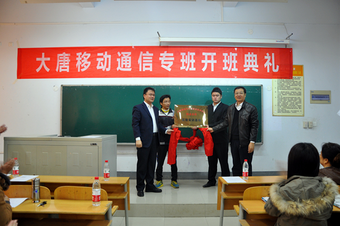 11月15日上午,上海大唐移动通信有限公司与我院联合开办的大唐移动通信专班开班典礼暨实训基地揭牌仪式在教学楼2207室隆重召开。副院长彭志宏、肖珑出席仪式。上海大唐移动通信设备有限公司副总经理李宏庆、西北业务区总经理张继书、大区培训总监程熙熙应邀参加。合作办学处副处长李小强及电气工程系领导参加仪式。