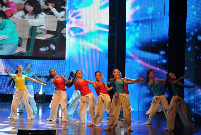 省人民大会堂现场,灯火辉煌,红旗飘飘。来自全省各高校的青年学子欢聚一堂,用青春的激情和高超的艺术才华为现场观众奉上了一场美轮美奂的视听盛宴。我院音乐学院28名舞蹈专业学生组成的舞蹈队为流行歌曲联唱伴舞,同学们活力四射的动感舞姿和不断变化的队列,赢得了全场观众的阵阵掌声,充分展现了我院大学生的靓丽风采。