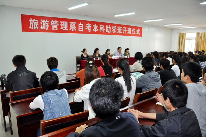 4月20日,旅游管理系第一届自考本科助学班开班仪式在综合楼625室举行,共有68名学生参加。继续教育学院院长胡锡凤,旅游管理系主任陈佳平、副主任李岚参加仪式。
