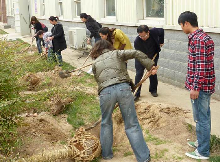 王洪波老师首先介绍了所植树木的特点以及栽种的技术要领,大家有序领取树苗和劳动工具,按布置好的植树点依次进行植树。现场呈现出一片繁忙景象,大家按照种苗、培土、踏实的植树工序认真劳动,经过两个小时的共同协作,顺利完成了种植任务,提高了图书馆全体馆员的环保意识和主人翁意识,为学院增添了一篇亮丽的绿色。
