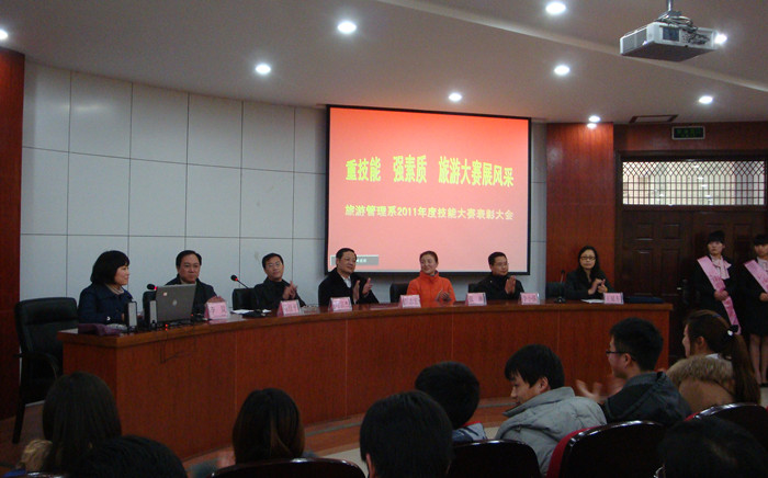 3月22日下午,旅游管理系在行政楼圆形会议室召开了2011年度旅游技能大赛表彰大会。副院长彭志宏、教务处处长周宗杰、招就处处长张琳、合作办学处副处长李小强出席会议。该系全体教师、获奖选手及100余名学生代表参加了会议。会议由该系副主任李岚主持。
