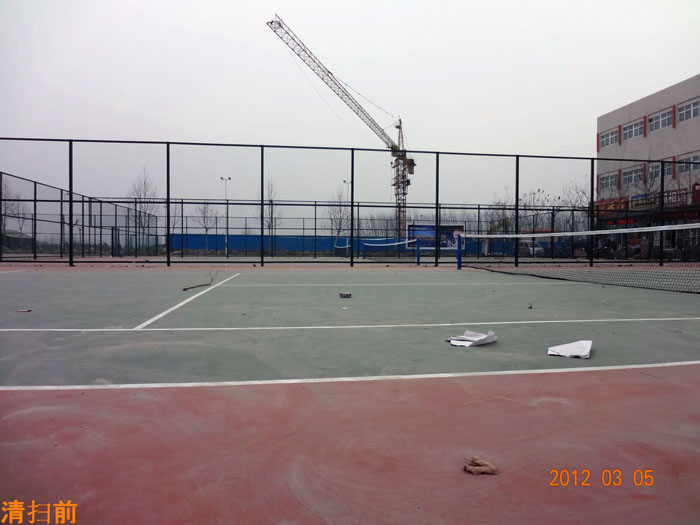 当天上午十点半, 10级计应专业93名同学自带工具开始了清扫活动。活动中大家发扬不怕苦、不怕脏、不怕累的作风,下不了工具的缝隙就用手去掏,绝不放过每一个角落。经过近两个小时的清扫,700多平方的网球场、羽毛球场、排球场、篮球场又恢复了崭新的面貌。