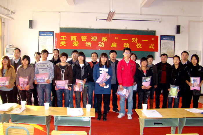 11月10日下午,工商管理系2011年度“一对一”关爱活动启动仪式在商务礼仪实训室举行。占江副院长出席仪式,并为学生赠送生活用品。