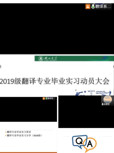 6月7日晚20:00,湖北大学外国语学院翻译专业2019级毕业实习动员会在腾讯会议平台举行。会议由学院翻译专业副主任步婧 主持。本次动员大会共分翻译专业毕业实习要求讲解,翻译专业毕业实习分享以及毕业实习问题答疑三个环节。