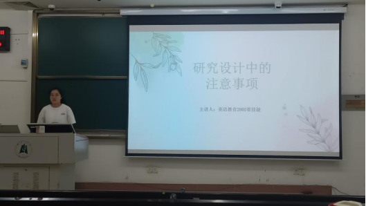 讲座上,学院2020级英语师范专业崔佳捷同学结合自己的毕业论文分享了研究设计中的注意事项。