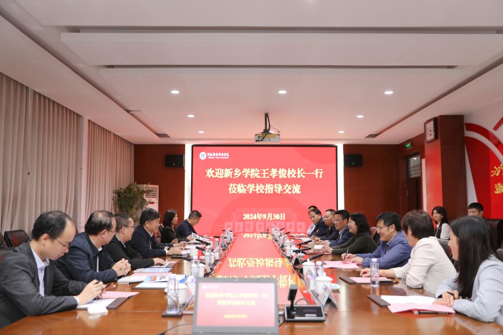 9月30日下午,新乡学院校长王孝俊带领校长办公室、党委宣传部、科研处、研究生处、3D打印学院和人文学院负责人等一行8人来河南职业技术学院考察交流。校长夏新颜、副校长任枫轩,党政办公室、党委宣传部、科技开发处、智能制造学院、电子与物联网学院和基础教学部等相关单位负责人参加座谈会。座谈会由任枫轩主持。