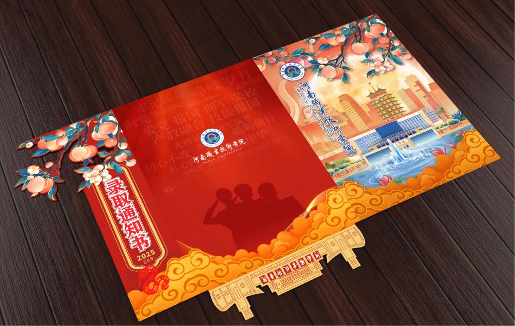 学校2025年的录取通知书由数字创意与设计学院赵永立老师设计,采用高纯度、充满活力的“中国红”作为主色调,以喜庆、热烈、庄重、现代且富有深意的视觉语言,传达了学校对2025级新生的诚挚欢迎与殷切期望,同时展现学校的办学特色、地域文化底蕴和精神风貌。