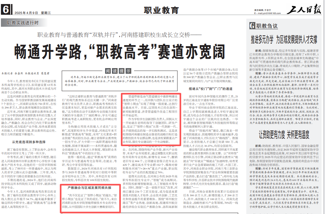 近年来,河南不断完善职业教育体系,建立了从中职到高职再到职教本科的完整人才培养链条,同时,职业教育与企业、产业深度融合,产教融合、校企合作已内化于职业教育的全过程,成为促进产业升级、培养高素质技术技能人才的重要力量,职业教育的适应性、吸引力和贡献度不断提升。