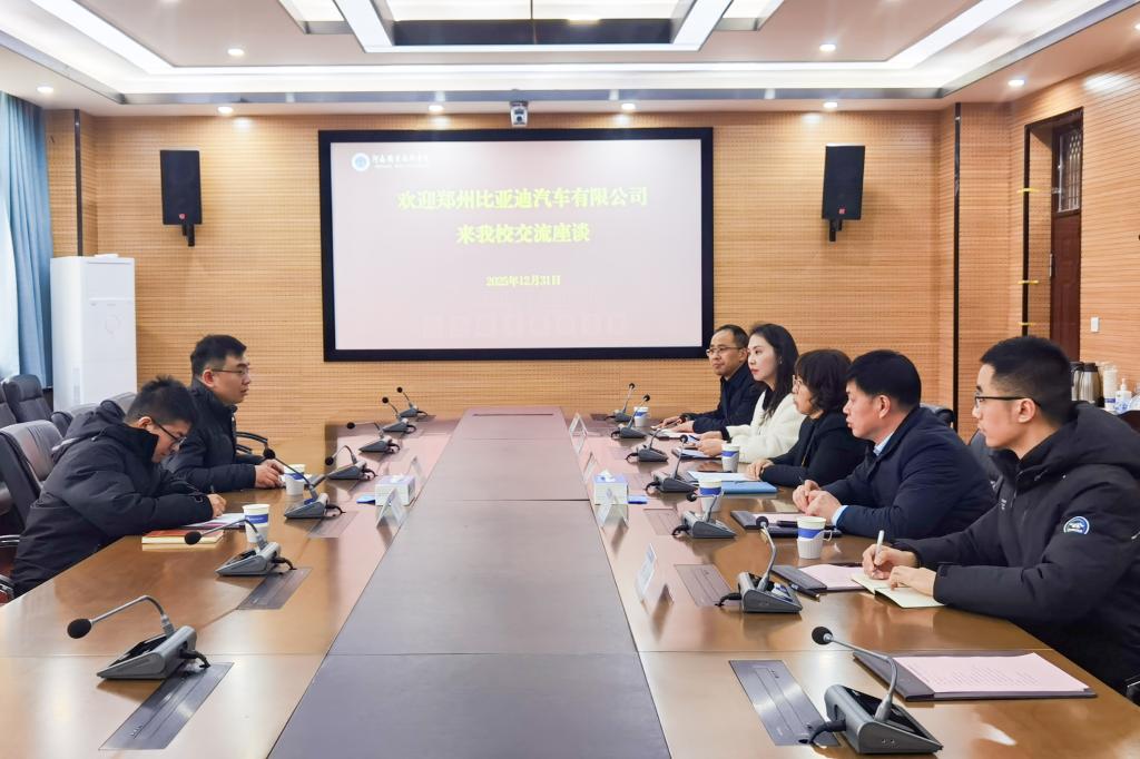 近日,郑州比亚迪汽车有限公司人事经理任永斌一行到河南职业技术学院开展校企合作交流座谈。校党委委员、副校长肖珑出席座谈会并讲话。发展规划处、汽车与交通学院相关负责人及教师代表参会。
