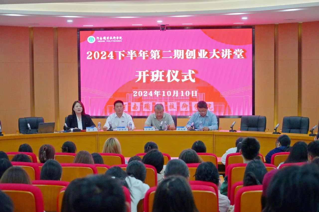 近日,河南职院2024下半年第二期创业培训开班仪式暨创业大讲堂活动在行政楼239会议室举行,电商物流学院党总支书记解鹏程、继续教育学院院长梁保然、河南宏博测控技术有限公司总经理卜祥洲以及优秀学员代表等共计170余人参会。