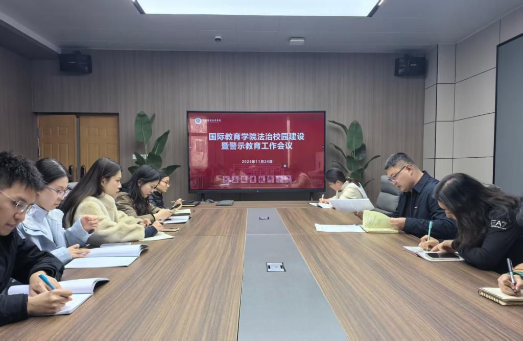 会议传达学习学校2025年法治校园建设工作会议精神,并结合实际对国际教育学院下一阶段法治校园建设工作进行安排部署。会议要求,全院师生要进一步深入学习贯彻习近平法治思想,持续深化学校“大法治生态工程”建设,以严的基调、实的作风,为学校高质量发展与高效能治理夯实法治根基。与会人员一起观看了《教育部公开7起师德违规案例》《醉·醒》和《校园火灾案例警示》等三部警示教育片,以案示警,教育大家要遵守国家法律、严守师德师风底线、防范火灾隐患、争做文明教师。