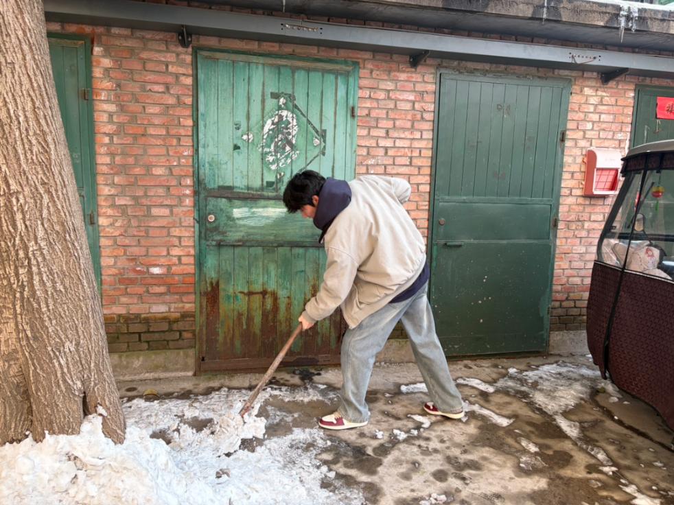 食加242班王一鸣,在济源市矿机家属院清扫小区地面的冰层。面对强降雪后社区单元楼门前积雪结冰导致的居民出行难题,他主动参与“寒冬暖行”志愿服务,打通居民出行“最后一米”安全通道,保障了老年人、儿童等特殊群体的出行安全。此次经历让他深刻体会到“民生无小事”,青年应立足基层办实事,在克服严寒劳累中锤炼了意志品质,提升了问题解决与沟通能力,更坚定了将个人理想融入家乡建设的信念。