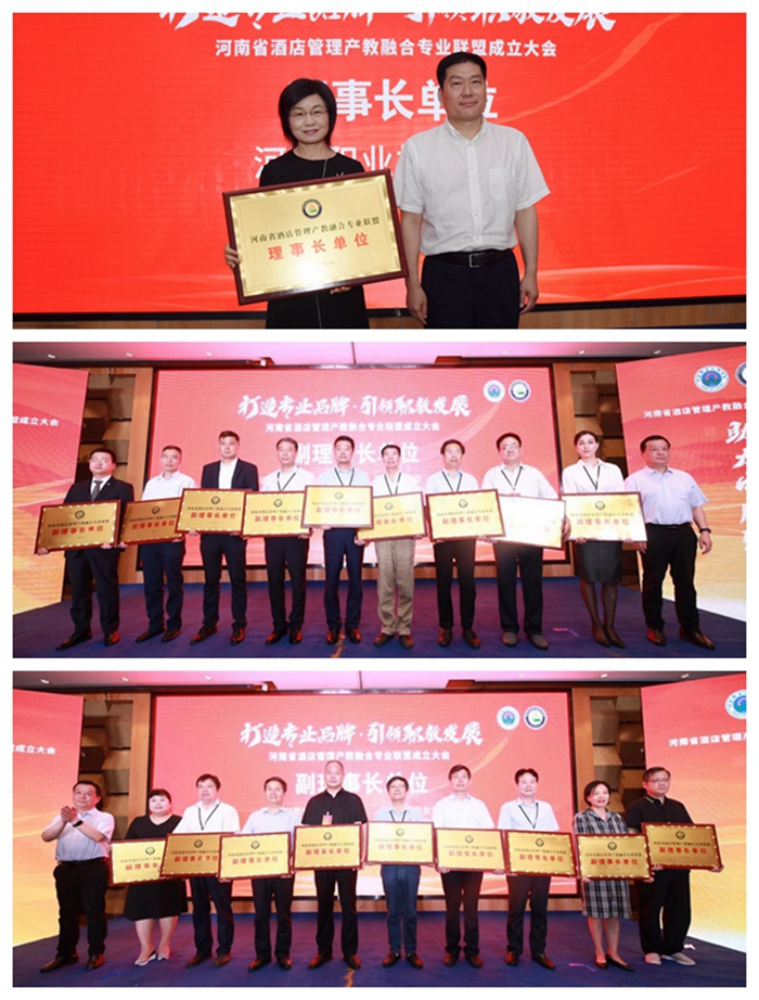 大会表决通过了河南职业技术学院为理事长单位,黄河水利职业技术学院、河南工业职业技术学院、河南农业职业学院、郑州铁路职业技术学院、许昌职业技术学院、河南经贸职业学院、河南交通职业技术学院、郑州旅游职业学院、洛阳职业技术学院、河南质量工程职业学院、濮阳职业技术学院、焦作工贸职业学院、中国旅游出版社、河南省黄河迎宾馆、郑州建国饭店、上海富悦大酒店、杭州开元萧山宾馆、河南酒店网为副理事长单位,与会领导为理事长单位、副理事长单位进行了授牌。