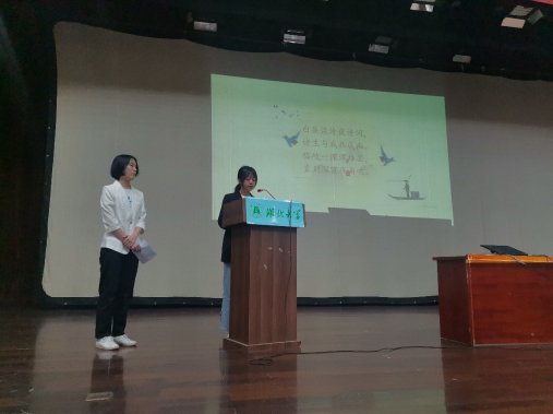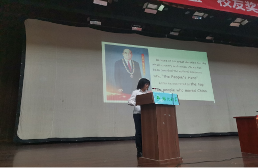 最后一场报告是由外国语学院“万年青”志愿服务队带来的题为《听榜样故事,传党史精神》的宣讲,李诗洁、张洲亚和付金君同学用英语讲述了“中国最后一位女先生”叶嘉莹和人民英雄张定宇的事迹,展示了他们身上顽强拼搏、坚忍不拔和为人民服务的崇高精神。