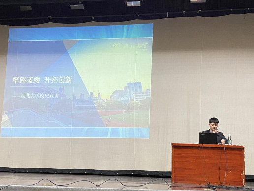 段秋炯老师以《筚路蓝缕、开拓创新》为主题,为同学们进行湖北大学的校史宣讲,祝贺母校九十年华诞。段秋炯梳理了湖北大学几经改名、迁校的艰苦发展历史,通过讲述湖北大学办学的艰难历程向同学们诠释了湖大师生在克服困境中形成的“自强不息,克难奋进”的习坎精神,鼓励外院学子秉承优良的传统,践行“日思日睿,笃志笃行”的校训精神,争做时代新人。