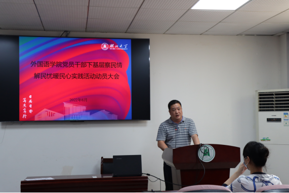 动员会上,刘建伟传达了《湖北大学关于推动党史学习教育常态化长效化的实施意见》和5月30日学校实践活动动员部署会有关精神,对《湖北大学外国语学院关于党员干部下基层察民情解民忧暖民心实践活动的实施方案》作了详细说明,并对学院实践活动进行全面部署和动员。