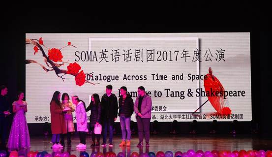 (文/李青树 图/姚丽昕、成季媛)12月21日晚6点30分,SOMA英语话剧团2017年年度公演在湖北大学小礼堂隆重举行。本次晚会由共青团湖北大学委员会主办,共青团湖北大学外国语学院委员会承办,湖北大学学生社团联合会及湖北大学SOMA社团联合出品。外国语学院党委书记林二友、副院长郭熙煌、党委副书记罗超出席了本场晚会。武汉大学、华中科技大学等多个友好高校的兄弟社团前来支持。