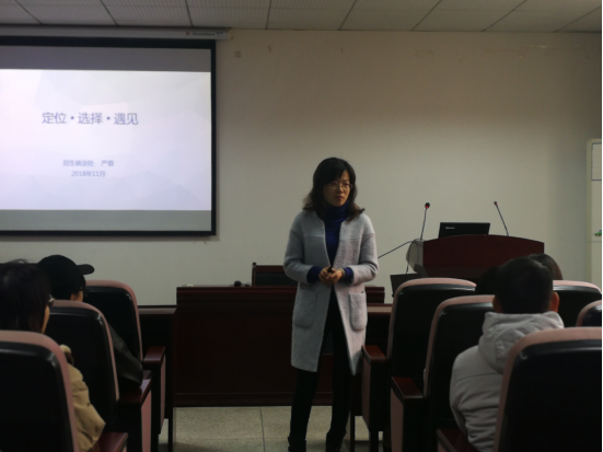 11月21日下午2:30,由外国语学院团委主办的以“定位•选择•遇见”为主题的大学生职业规划类讲座在逸夫楼A1014顺利进行。湖北大学招生就业处严蓉副教授、外国语学院党委副书记占婧以及外国语学院16、17级部分学生参与此次讲座。