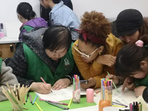 为促成此次活动的顺利进行,负责人提前与国际留学生和外语宣讲队进行沟通,做好相关对接工作。下午两点,外院志愿者与外院宣讲队成员及国际留学生共同聚首阳光家园,一场中外碰撞融合的志愿活动就此展开。活动以雷锋故事作为开场,宣讲队成员用中英文交替进行的方式,向阳光家园的学员和国际留学生详细讲解了关于雷锋的生平事迹和个人语录,在场的留学生对雷锋精神的内涵有了更深刻丰富的领会。在一同带领学员复习之前所学的英文单词之后,志愿者邀请留学生和学员共同制作雷锋卡通折扇,在小组合作过程中,大家畅所欲言,纷纷构想出自己心目中的雷锋形象,而留学生的新奇想法也让大家对刻画雷锋形象有了一些新创意,开始纷纷用彩色水笔在折扇上描绘涂鸦,展示环节中,大家积极地分享交流彼此的作品,发表自己对雷锋精神的理解。在活动的尾声,一名留学生操着流利的中文发言到:“这次雷锋月的实践使我更加熟识雷锋平凡而光辉的一生,也体验雷锋同志艰苦朴素的作风和乐于助人的品格,参加这个志愿活动也让我在服务他人的同时,亲身体验了雷锋精神。”