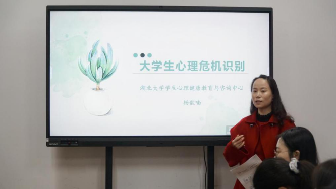 3月27日外国语学院班主任培训会在逸夫楼A1014展开,湖北大学学生心理健康教育与咨询中心专职老师杨歆喃受邀开展题为“大学生心理危机识别”的讲座。