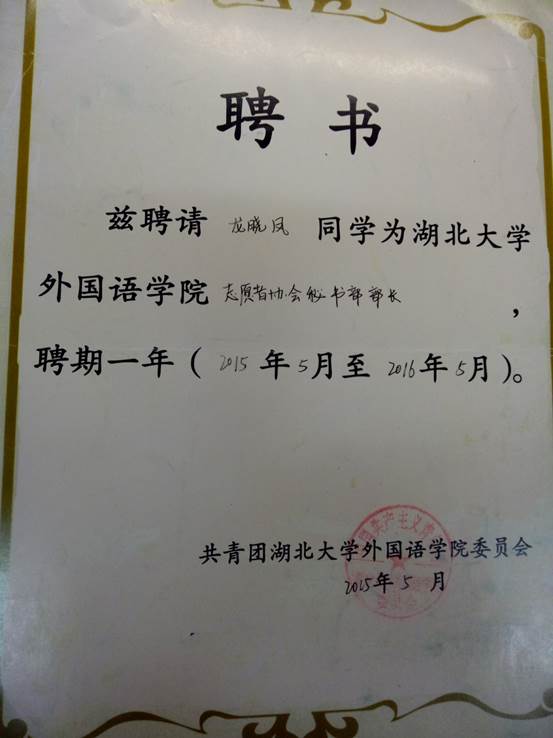除此之外,龙晓凤还积极参加志愿服务活动,因为人生的价值不仅在于实现自我价值,更在于对社会的价值贡献,所以龙晓凤加入了外国语学院志愿者协会,参加了诸如“善行100”之类的志愿服务活动。“我喜欢志愿活动,所以我愿意花时间去做”龙晓凤真诚的说道。