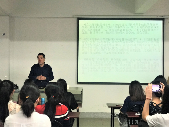 龚老师在两个多小时的演讲中,结合新高考、核心素养、教学管理等方面的内容,向师生们深入浅出的阐述了来自一线骨干教师的教学管理经验成果,启发了师生对英语核心素养与英语测试的思考;鼓舞师生不懈努力,向更高的目标迈进,受到了师生的一直好评。