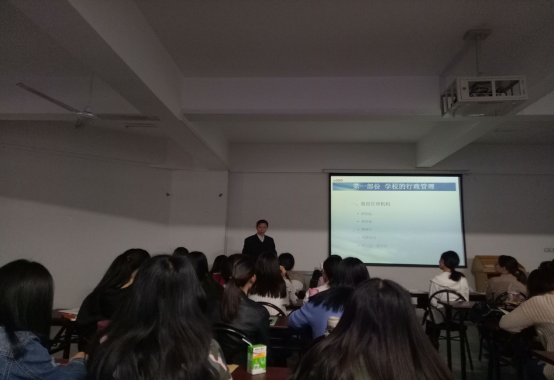 讲座伊始,黄教授首先依次向大家介绍了教育管理机构:国务院、教育部、教育厅、市教育局、区(县)教育局及其职能。随后,他还指出学校的种类主要包括:省级示范、市级示范、普通高中、民办高中以及中等职业学校。在谈到学校内行政管理机构时,黄教授主要针对办公室、教务处、政教处、总务处及其它财务等管理部门进行了详细地讲解。此外,关于学校的业务组织机构及其职能,他主要介绍了年级组、教研组、备课组、班级。
