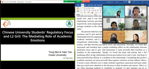 会上,梅勇老师与严亚波同学在“Teaching & Learning Strategies”板块分会场作20分钟主旨发言,共同介绍了他们的研究成果“Chinese University Students’ Regulatory Focus and L2 Grit: The Mediating Role of Academic Emotions”,并对与会学者提出的问题和困惑进行了解答和互动。