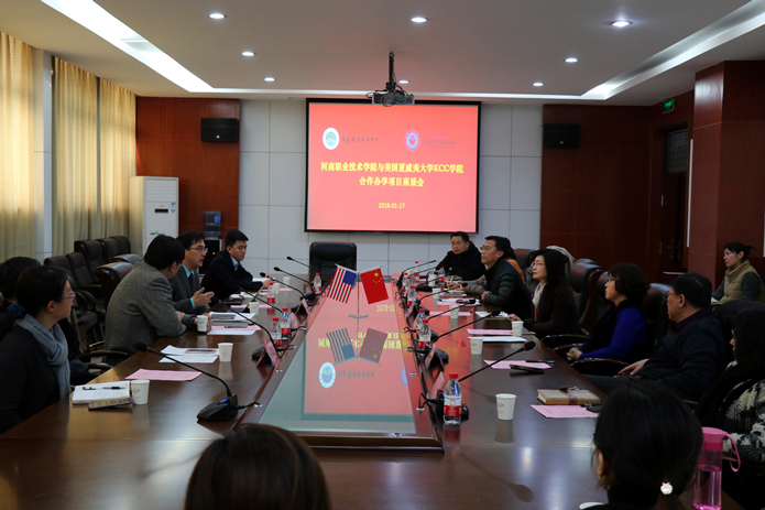 1月17日下午,美国夏威夷大学卡比奥拉尼学院(以下简称KCC学院)国际部主任Cy.Feng在该院中国首席代表杨柏等陪同下一行3人到访学院,就学院首个对外合作办学项目的实施进程和运行情况进行阶段性总结与座谈。学院院长李桂贞和副院长肖珑出席座谈会,教务处、环境艺术工程系、旅游管理系、工商管理系和合作办学处的负责人以及相关专业教师也参加了座谈。