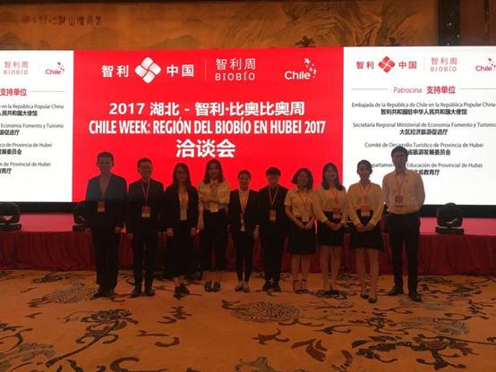 2017年9月7日-9日,第三届“智利周”在武汉举行,“智利周”是由智利政府组织的推广智利国家形象、展示其商品及服务出口实力的全球性活动,2017湖北-智利比奥比奥周系列活动参会单位为国内外知名企业,如中国长江航运集团,武汉中博酒业股份有限公司,中商平价连锁有限公司,赖凯雷特进出口食品有限公司等中方企业代表以及CIPACHILE, Agricola El Manzanar de Picoltue Ltda.,Blue Ocean SPA, Austral Garden of Seaweed S.A.等。根据湖北省外事办安排,湖北大学外国语学院口译队10名志愿者承担了本次“智利周”的大会服务接待工作,为中智企业代表提供口译服务。