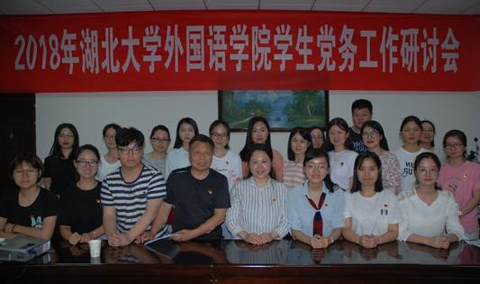 2018年5月30日,外国语学院学生党务工作研讨会在逸夫人文楼A4011举行。学校党建组织员闸文朗、外国语学院党委书记林二友、党委副书记占婧、团委书记向杨、学院党建组织员邱俊、学院全体学生党支部书记及委员参会。