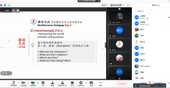 教研活动通过腾讯会议在线上进行,由陈培老师做主题为“课程思政背景下的多模态英语教学探索”的教学分享。陈老师以自己所讲授的《中国文化导论》课程为案例,向老师们详细介绍了如何在教学目标、教学策略与方法选择、课外自主学习设计、教学测量与评价、教学资源等方面有机融入课程思政。陈老师的分享从教学理论联系到课堂实操,深入浅出,逻辑清晰,让老师们受益良多。分享结束后,老师纷纷就自己对“课程思政”的理解和在实际教学中遇到的问题及对策作了热烈的讨论。