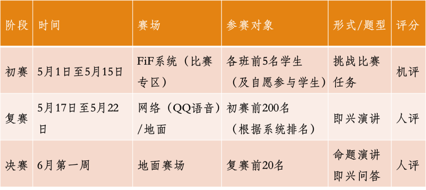 在FiF系统发布班级学习任务,学生以班级为单位,挑战学习任务,通过FiF系统机评,累积学习成绩,生成班级的年级排名。班级最终得分=班级平均分(50%)+随机抽取班上10%学生的成绩总和(50%)。个人赛相关安排参见下图。为保证比赛顺利进行,任课教师需完成:1、发布学习任务;2、督促所有学生积极参加班级赛;3、督促班级排名靠前的学生参加个人赛;4、督促班级排名靠后的学生完成学习任务;5、部分老师分担个人赛复赛和决赛评委工作。