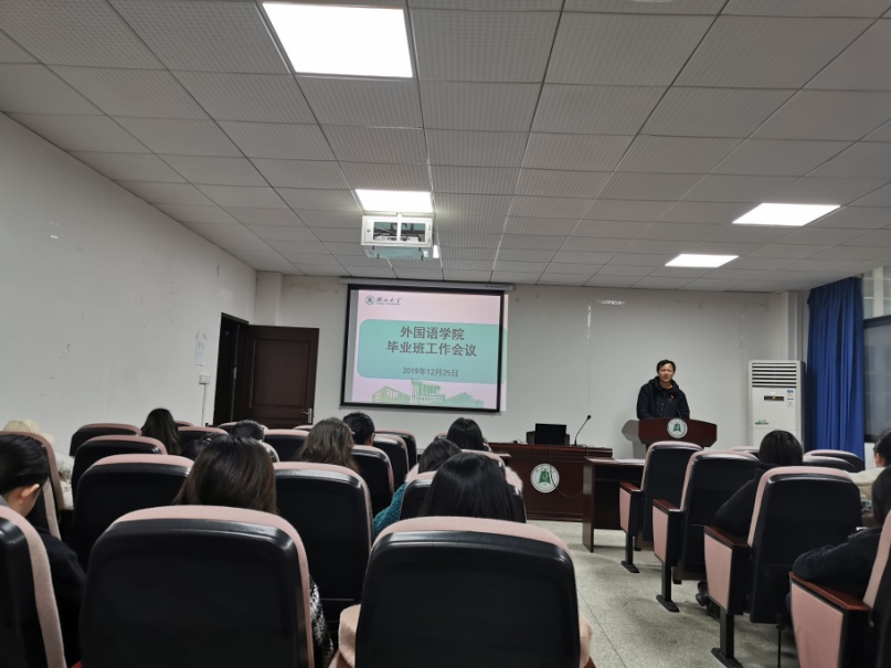 12月25日下午,外国语学院党委在逸夫人文楼A2014会议室召开2020届毕业班工作会议,学院党委书记林二友在会上讲话,党委副书记占婧主持会议,辅导员冷自衍、毕业班班长、心理委员和就业联络人等学生干部参加会议。