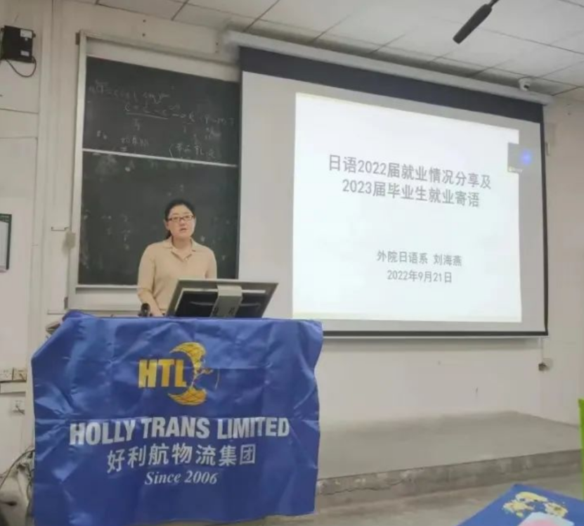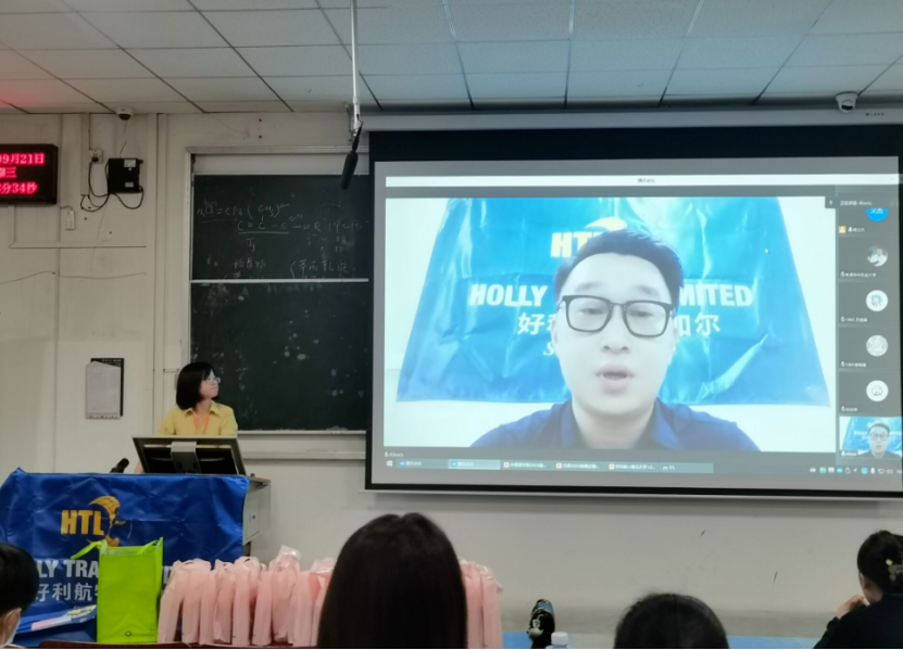 与此同时,好利航物流集团进行了职业规划专题培训和企业宣讲,并开展现场招聘。武汉分公司经理陶靓简要介绍了好利航的发展历史以及目前建设发展情况,分享了企业国外站点员工的生活和工作视频,并现场连线了目前在塞内加尔的法语专业2021届毕业生曹一凡同学,与同学们交流互动,答疑解惑。