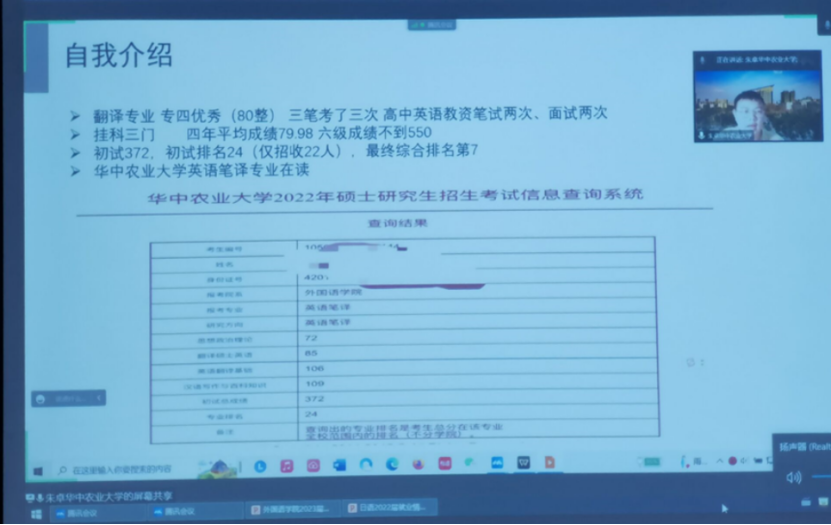 翻译专业2022届毕业生朱卓目前在华中农业大学读研,他线上与同学们分享了考研心路历程,鼓励大家要结合自己实际情况,谨慎做出选择,用毅力和恒心托举心中的梦想。