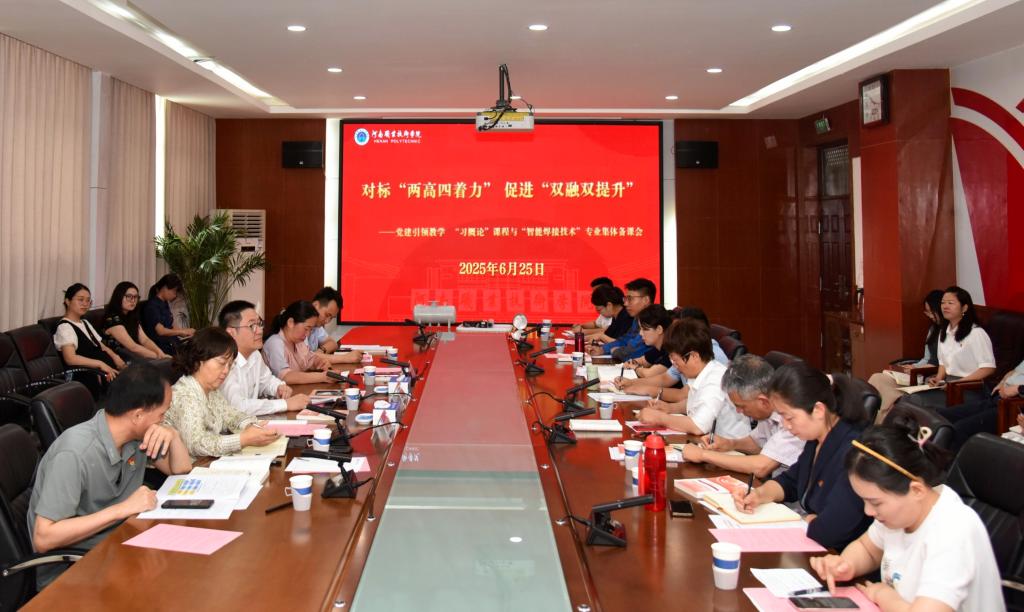 6月25日,河南职院马克思主义学院与材料工程学院联合开展“习近平新时代中国特色社会主义思想概论”课程和“智能焊接技术”专业课程集体备课会。校党委书记厉励出席并讲话。校党委副书记、工会主席田华,党政办公室、党委宣传部、马克思主义学院、智能制造学院等单位负责同志,以及教师和学生代表参加集体备课会。备课会由校党委委员、副校长肖珑主持。