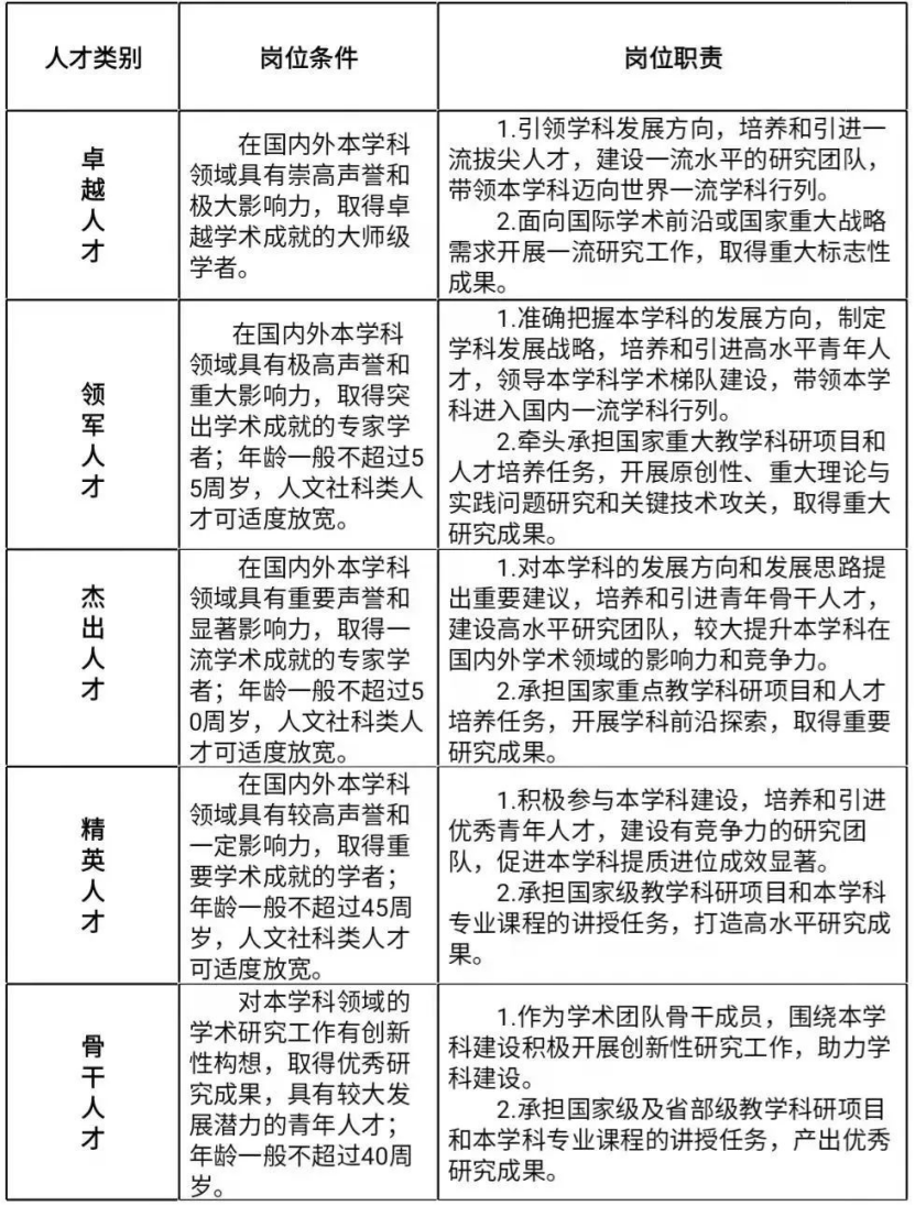 学校设有卓越人才、领军人才、杰出人才、精英人才、骨干人才共5类人才岗位,具体岗位条件和职责附后。
