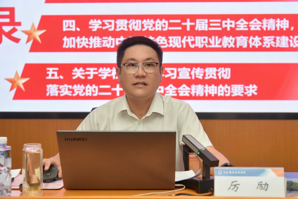厉励还就学校如何学习宣传贯彻落实党的二十届三中全会精神,强调四点要求。一是提高政治站位。要进一步统一思想、提高认识,把准吃透核心要义、丰富内涵和实践要求;二是抓好“五级”宣讲。要开展集中专题宣讲,做到全校“五级”宣讲齐联动,实现师生学习全覆盖;三是强化理论阐释。要开展深入研究,发表阐释文章,推出有深度、有分量的研究成果;四是务求学习实效。要把学习贯彻全会精神与学校新一轮“双高计划”遴选和职业本科创建等重大工作紧密结合起来,既立足当下又着眼长远,扎实做好下半年工作,以实绩实效和师生群众满意度作为检验学习全会精神的效果。