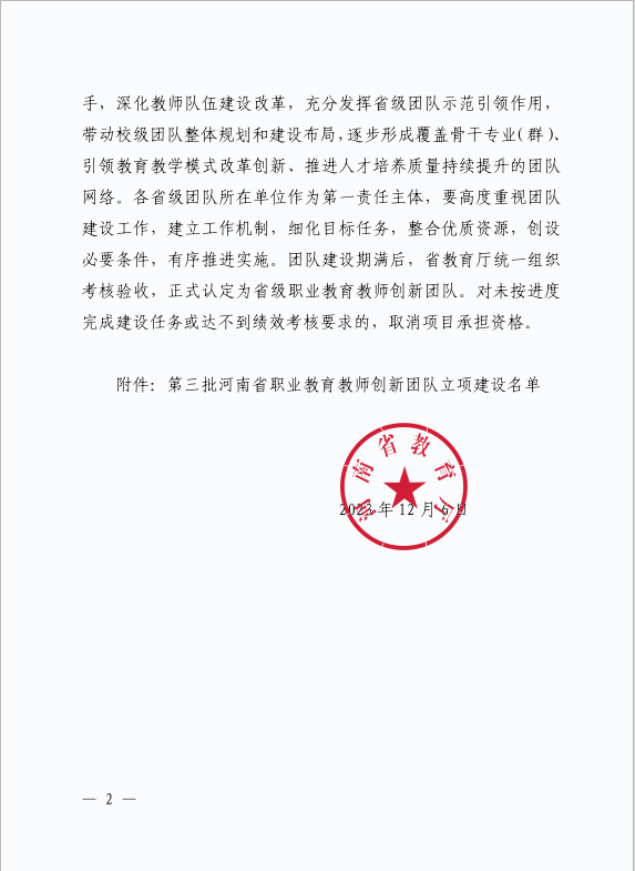 2023年12月,汽车检测与维修技术专业获批第三批“河南省职业教育教师创新团队”。